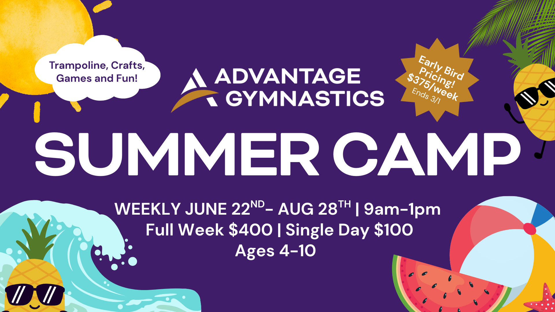 With 10 action-packed weeks of camp, kids stay active all summer long with gymnastics, trampoline, games, and nonstop movement in a positive, coach-led environment. Choose one week or join them all and give your child a summer full of flips, friendships, and unforgettable memories with their Advantage Family. Scroll to register!
